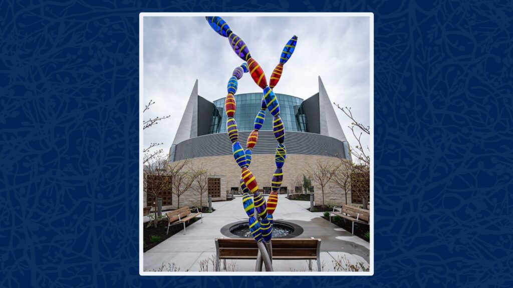 The story of the gardens continues in features throughout the room, including sculptural vines on the walls, natural oak wood throughout, and carpet and upholstery in shades of green. The columns and lights surrounding the room represent the twelve tribes of Israel and their story…