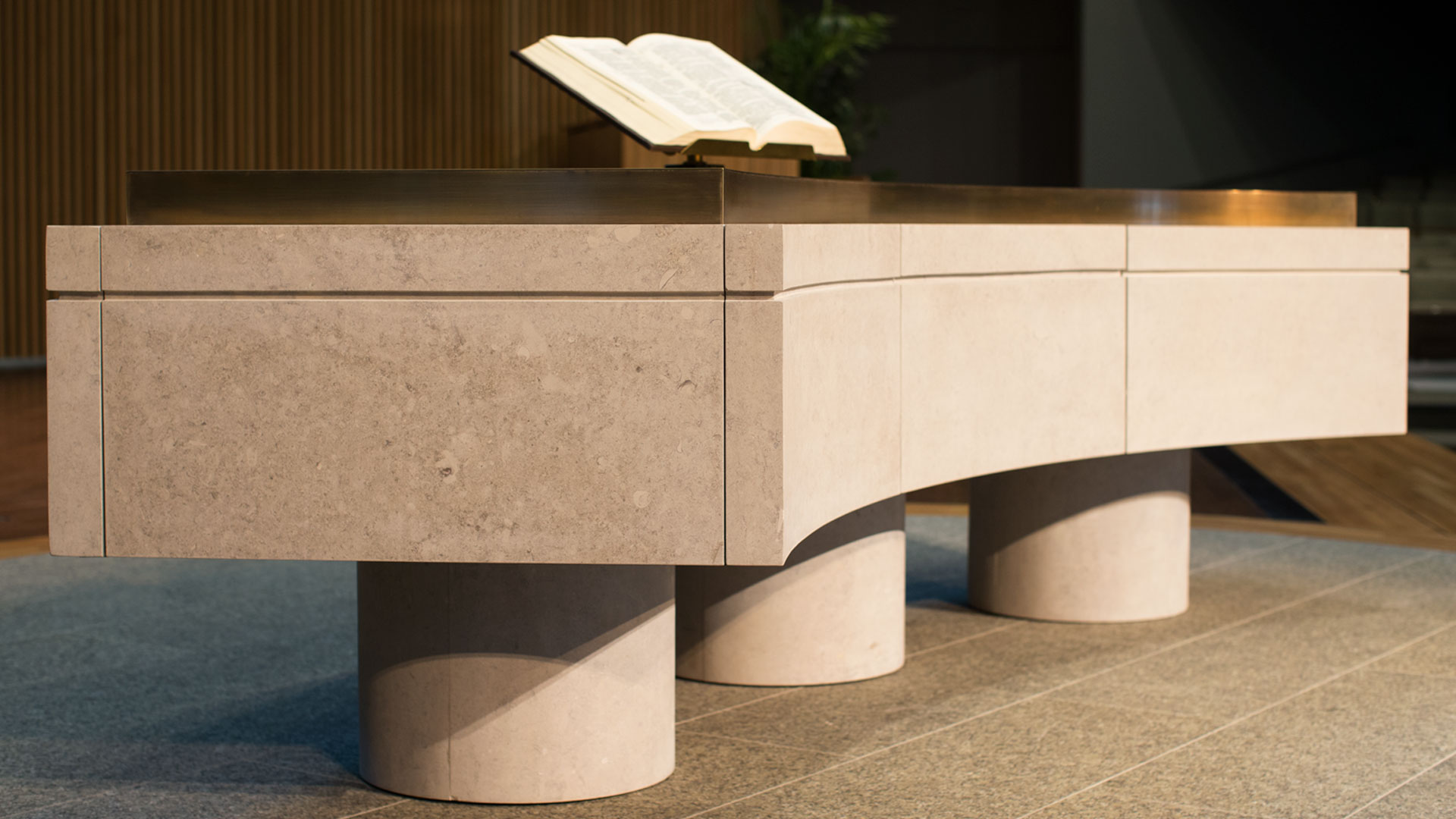 The altar is curved, a reminder of the formal dining tables of the first century, called a triclinium, and likely the kind of table where Jesus sat during the Last Supper (though his table would have been much lower). The top is bronze, like the altar in Moses’ tabernacle and later Solomon’s temple. This altar reminds us that Christ offered himself as a sacrifice for the world. The three columns that support the table remind us of the Father, Son and Holy Spirit.