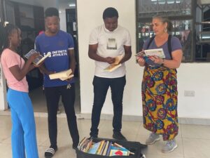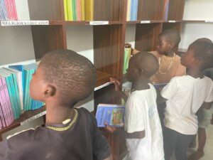 First we visited the library in the village of Ntanila. This site was selected for the library because it is close to several schools and villages with solar furthering the goal of education. We saw the processes to take in books and check them out. We saw their children’s library and many school age children were studying in another section. The children at the Church of Resurrection had gathered books for the children of Malawi and these gifts were presented to the library.